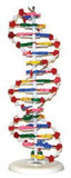 This double helix DNA model measures 25 x 8 inches, made of durable and colorful plastic and depicts a 16 base pair section built to a scale of 10cm to 1nm. The model is supported on a circular stand, which can rotate allowing you to view all of the components. The phosphate and deoxyribose are accurately portrayed and can be removed and separated for further examination, along with the individual base pairs.