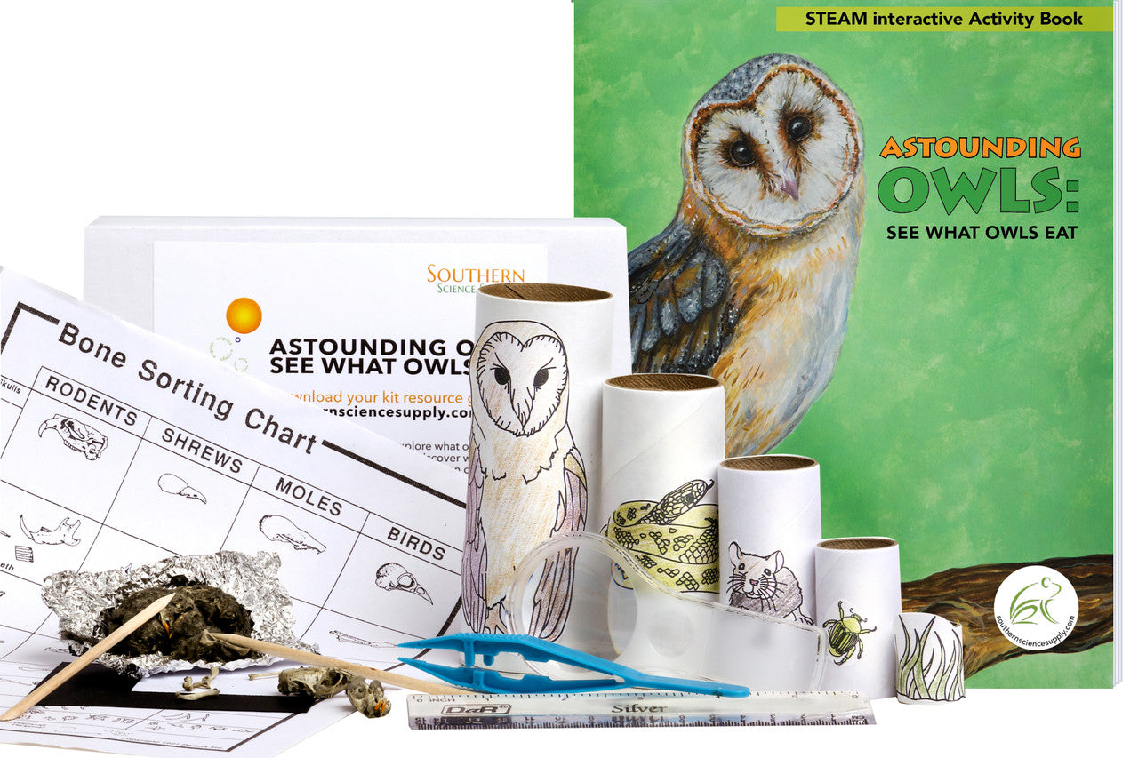 Explore the astounding world of owls with this exceptional kit that includes two owl pellets* (additional pellets are available, if desired), bone charts, wooden probes, forceps, a hand lens, a 6” ruler, a Resource Guide, and a 16-page STEAM interactive Activity Book. So, what is an owl pellet?