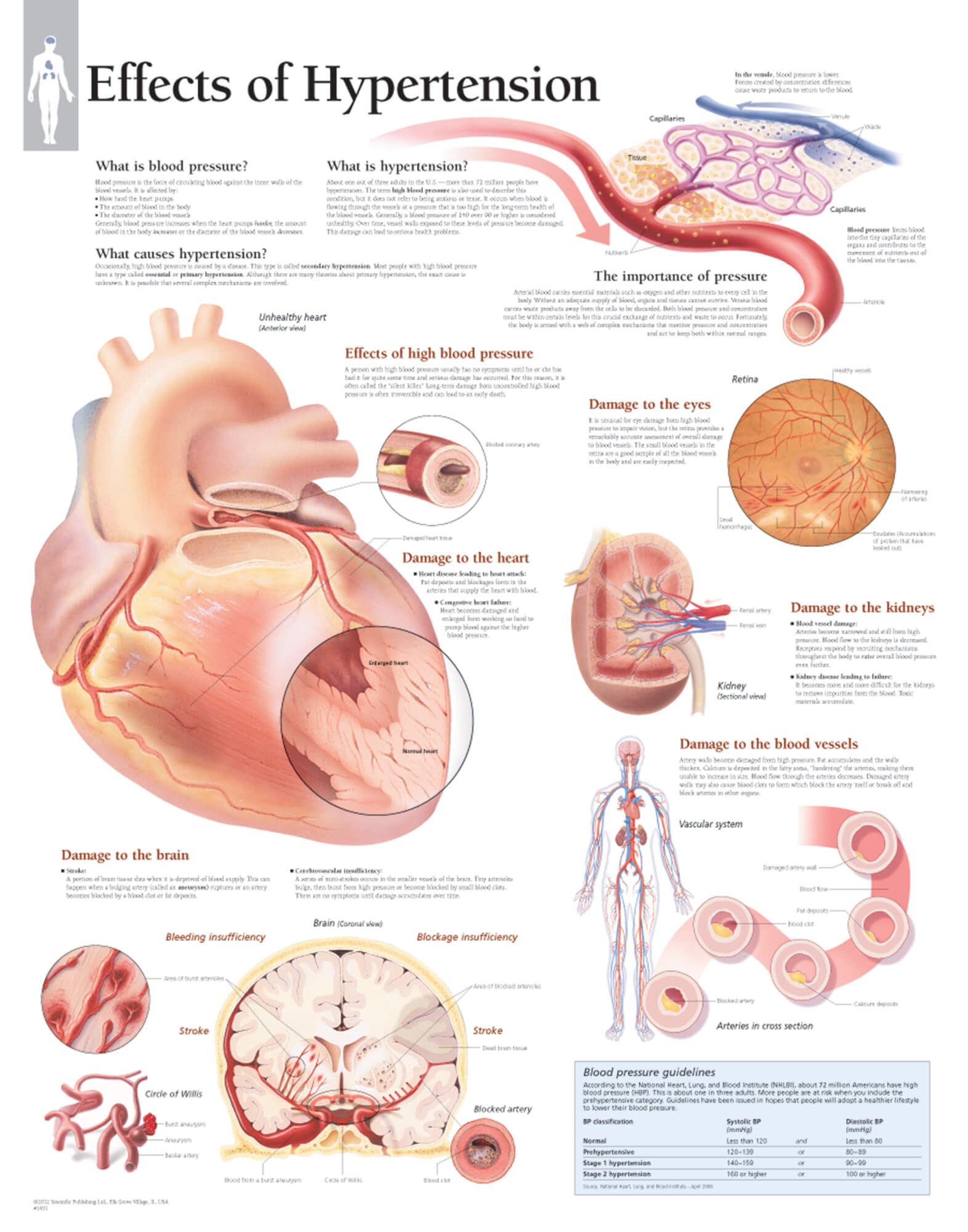 The Effects of Hypertension chart takes a look at the potential problems associated with high blood pressure. Topics that are covered by graphics and text include damage to the heart, eyes, brain, kidneys and blood vessels, as well as the progression of plaque build-up.
