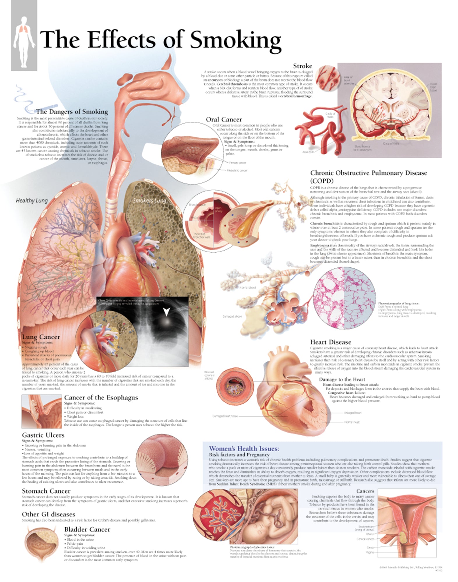 The Effects of Smoking chart takes a look at the problems and risk factors associated with smoking. Topics that are covered by graphics and text include stroke, oral cancer, COPD, heart disease and women’s health issues.