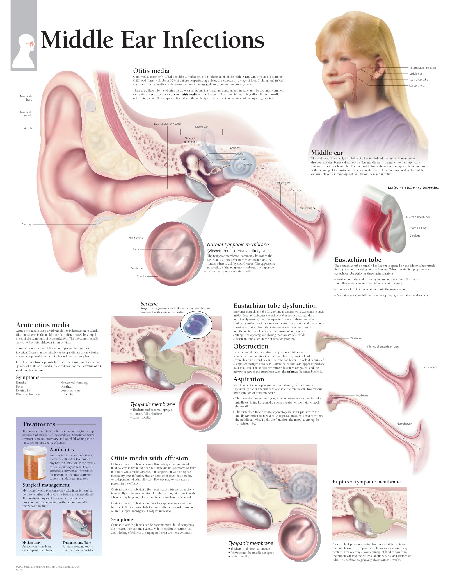 The Middle Ear Infections chart is a detailed overview of the causes, symptoms, and treatments for otitis media, or infection of the middle ear. Acute otitis media, otitis media with effusion and Eustachian tube dysfunctions are explained through graphics and type.