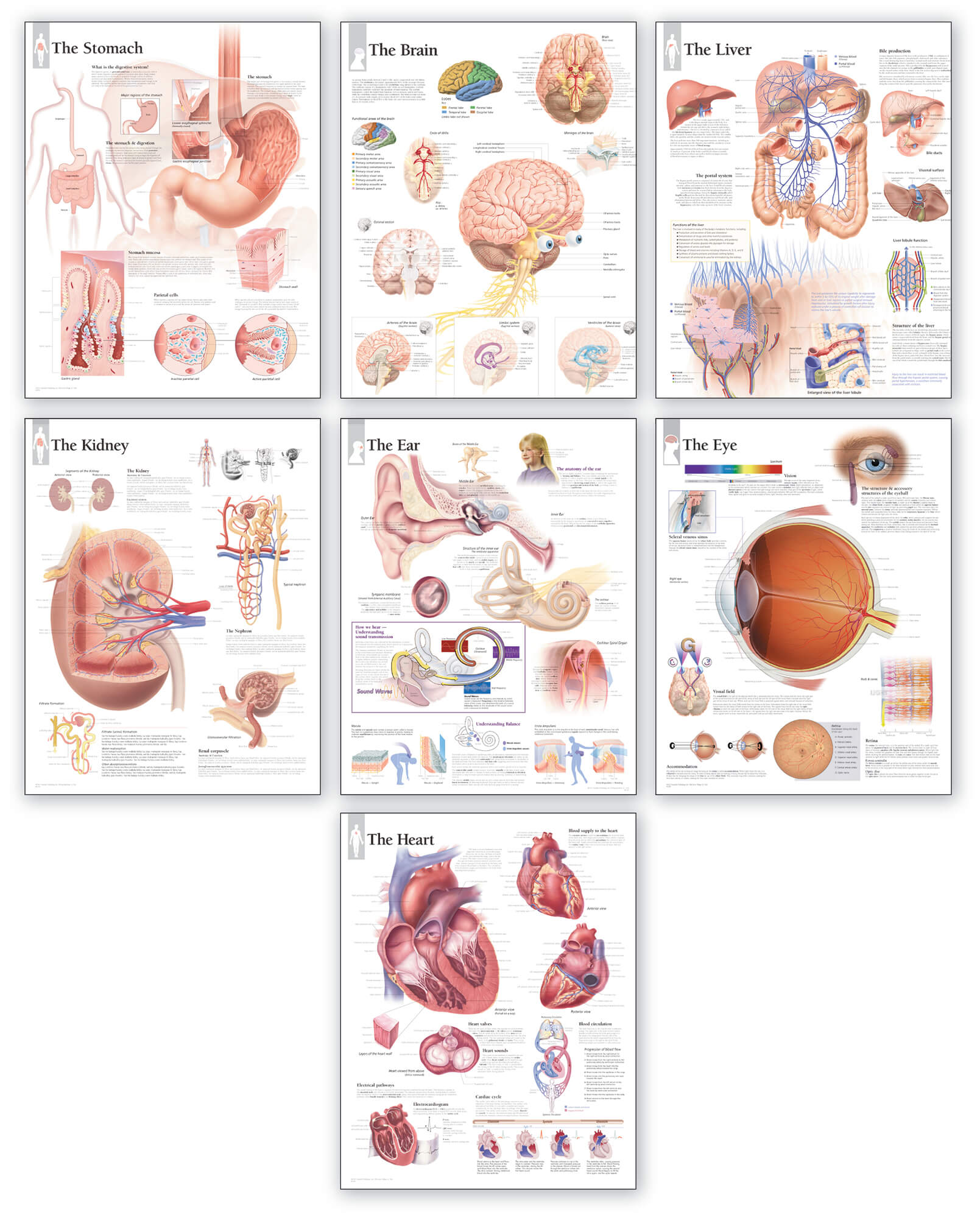 This series of 7 charts explores the major organs of the human body. Each chart graphically illustrates the general anatomy and function of a specific organ. Ideal for students or the informed consumer, the series is suitable for the home, school or physician’s office.
