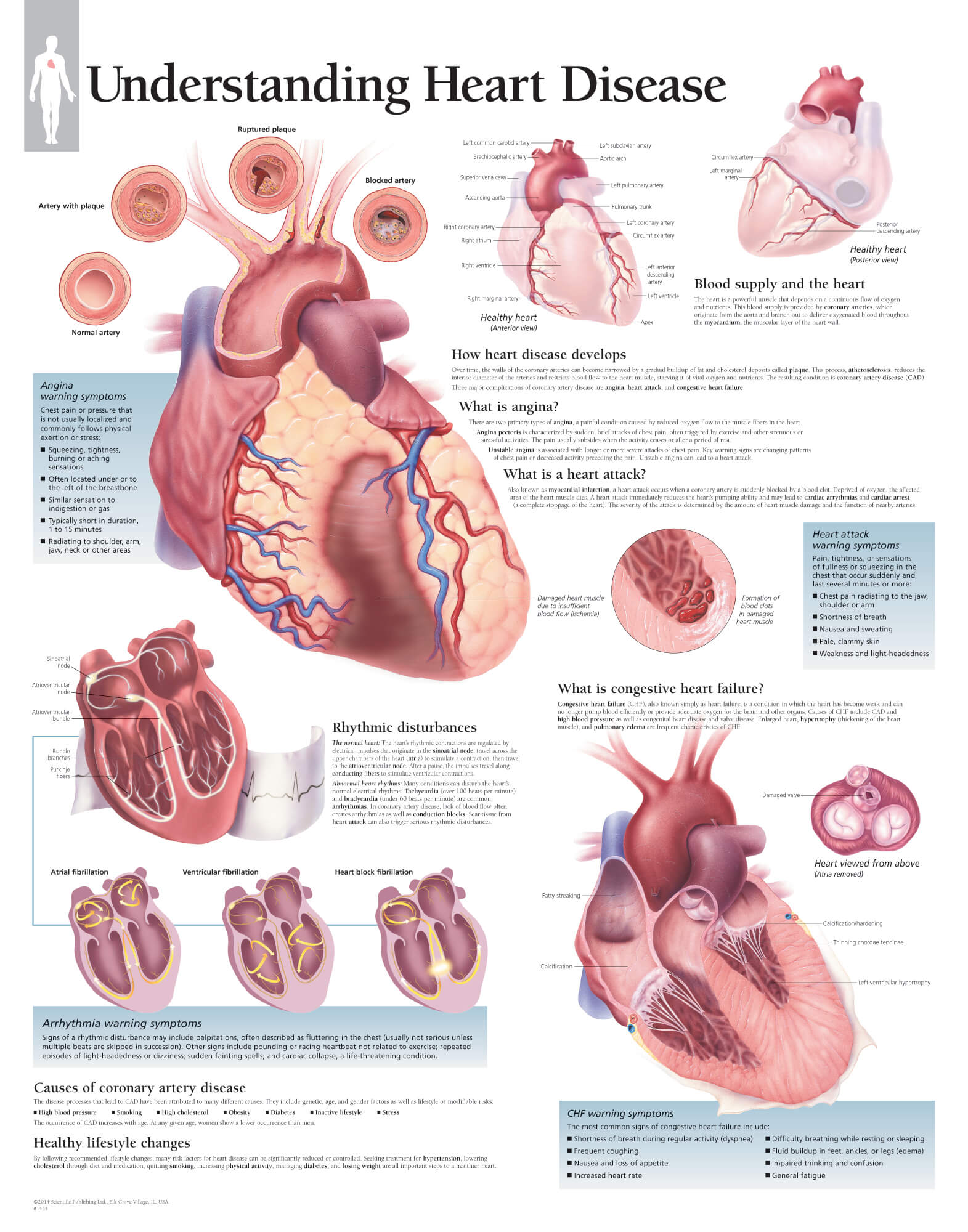 The Understanding Heart Disease chart graphically describes the issues and problems associated with this disease. The topics of angina, heart attacks, rhythmic disturbances and congestive heart failure (CHF) are covered with both images and text, including copy blocks describing the warning symptoms.