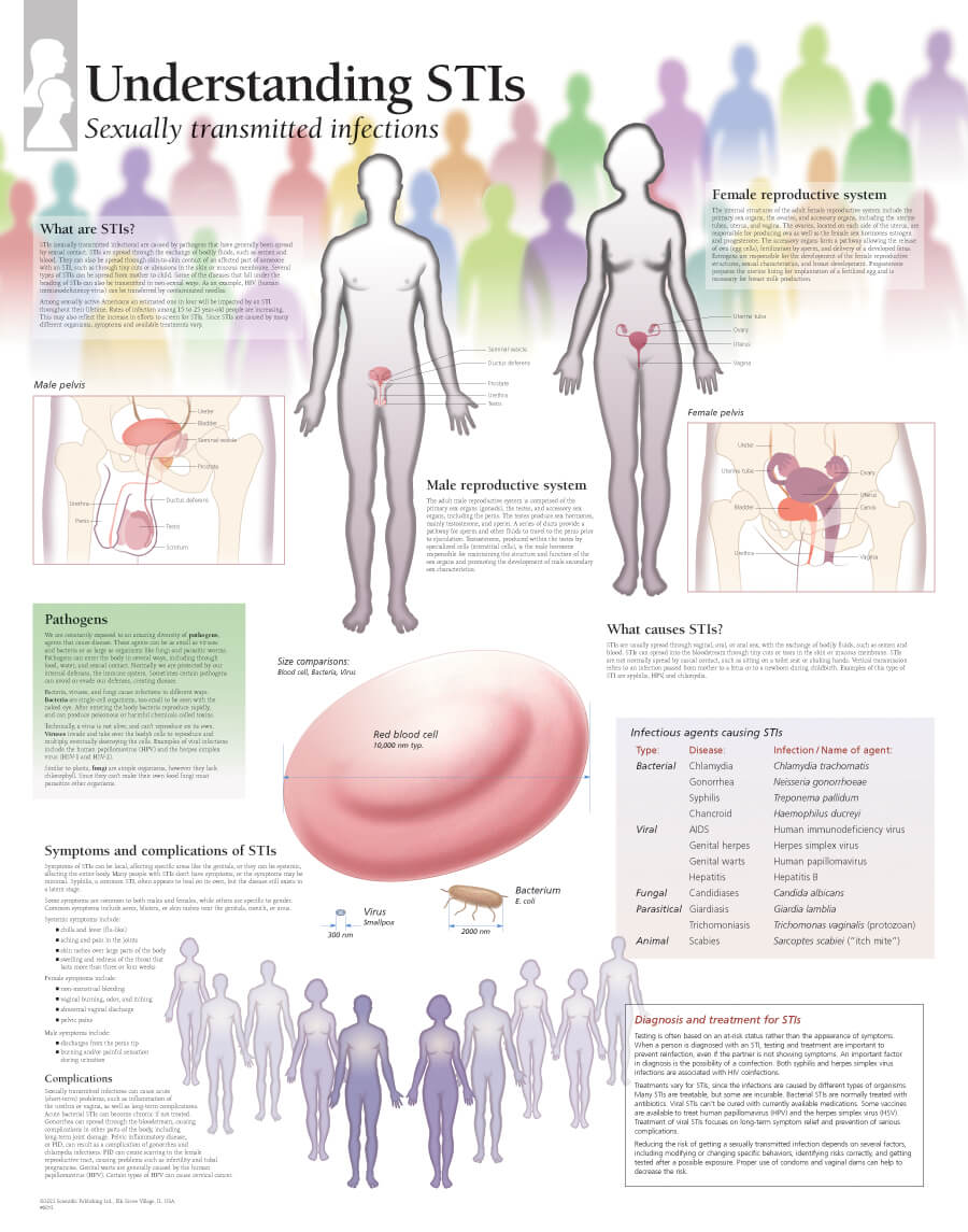 Understanding STI’s chart presents an overview of a major health issue facing both women and men, Sexually Transmitted Infections, sometimes called Sexually Transmitted Diseases (STDs). Female and male reproductive anatomy are described by graphics and text, along with sections decsribing pathogens, disease-causing agents. Text sections cover causes, symptoms, complications, and diagnosis and treatment.