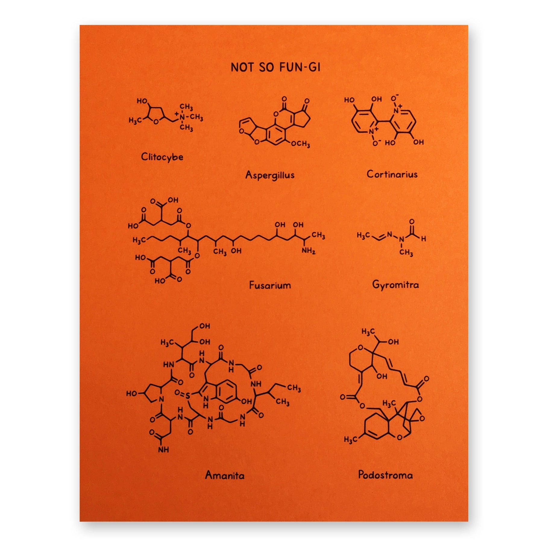 Print showing the molecular structures of some of the most dangerous toxins and poisons from fungi. Size: 8 x 10 inch.
